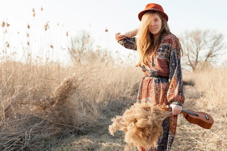 This could mean flowing fabrics, vibrant colorful prints, bell sleeve tops, funky headbands, boots, stacked bracelets etc.